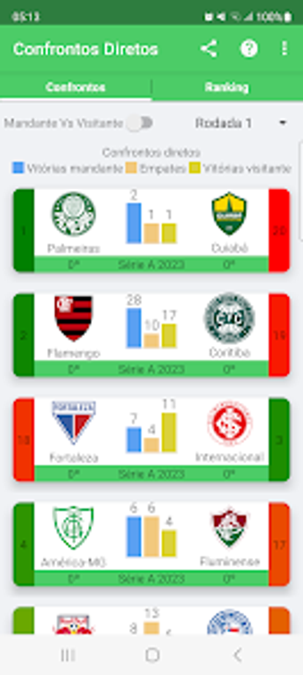 Aplikacja zawiera listę wszystkich meczów między drużynami, które grają w bieżącej rundzie, a wybierając opcję "Mandante Vs Visitante," możesz zobaczyć wszystkie mecze między tymi drużynami. Alternatywnie, odznaczenie tej opcji wyświetli tylko mecze, w których drużyna gospodarzy gra u siebie, a drużyna gości gra na wyjeździe. Aplikacja zawiera również listę wszystkich meczów każdej drużyny w trakcie Brazylijskich Mistrzostw Piłki Nożnej.